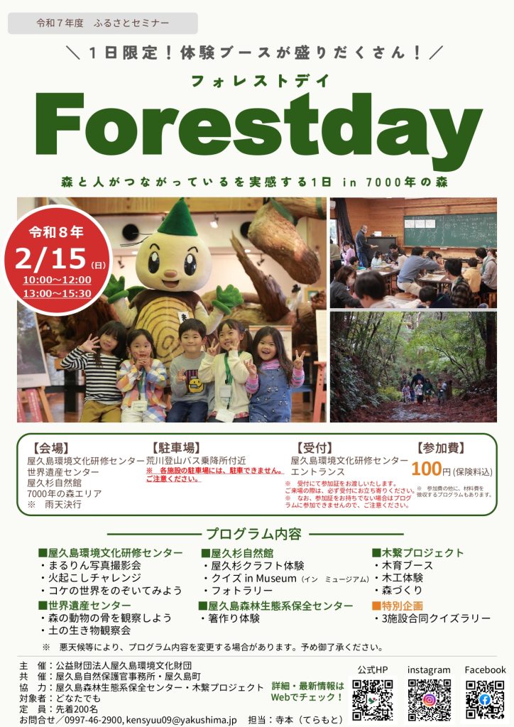 2月15日(日)に屋久島環境文化研修センター・世界遺産センター・屋久杉自然館の合同イベント「Forestday『森と人がつながっている』を実感する1日in7000年の森」を開催します。3つの施設内で体験できる様々なイベントを通じて「森と人とのつながり」を感じてみませんか。